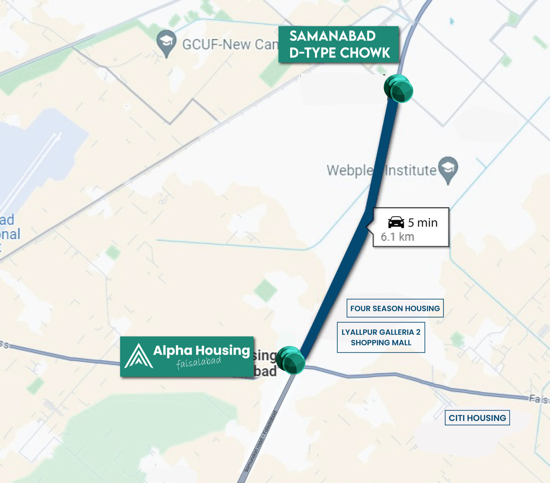 Alpha Housing is the best located housing scheme in Faisalabad. It is surrounded by developed area of the city. It is located only 5 Minutes from Samanabad D-Type Chowk, on Samundari Road, Faisalabad.